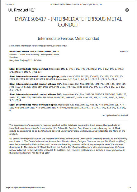 Πρότυπο:UL CERTIFICATE Αριθμός:E506417 Πεδίο εφαρμογής / Range:STEEL INTERMEDIATE METAL CONDUIT,ELBOW 45 90 Που εκδίδονται από:UL LLC |